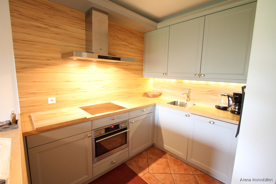 Die angrenzende, in Holzoptik gestaltete Küche ist mit hochwertigen Geräten ausgestattet und lädt zu gemeinsamen Kochabenden mit Familie und Freunden ein. Zwei liebevoll eingerichtete Schlafzimmer, ein modernes Badezimmer mit Dusche sowie ein separates WC ergänzen diese Etage.