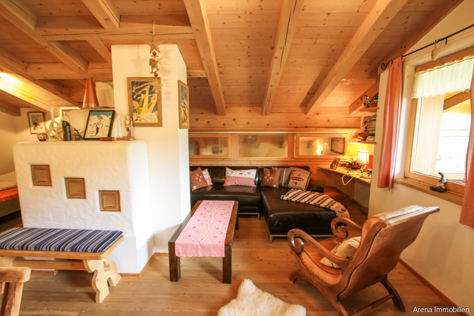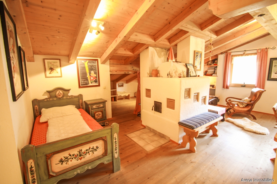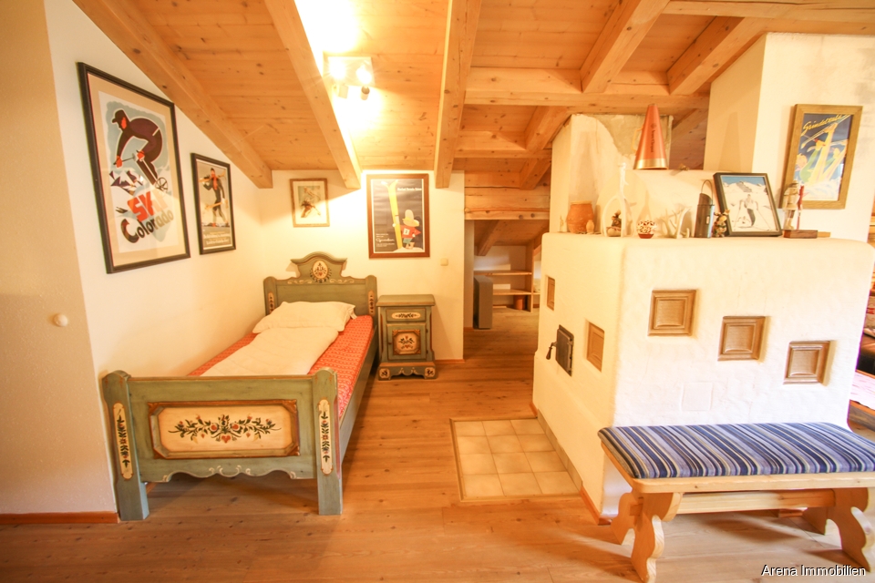 Der offene Wohnbereich überzeugt mit einer voll ausgestatteten Küche, einer einladenden Essecke, gemütlichem Sofa, TV und einem traditionellen Kachelofen, der in den kalten Monaten für wohlige Wärme sorgt. Ein Schlafplatz mit Einzelbett fügt sich harmonisch in den Raum ein. Von hier aus gelangt man in einen Nebenraum mit niedrigerer Raumhöhe und Dachschräge, der etwas vom Wohnbereich abgetrennt ist. Dieser gemütliche Bereich ist mit einem Doppelbett ausgestattet und eignet sich ideal als Rückzugsort.Das Highlight: der sonnige Südbalkon – perfekt, um den Blick auf die Berge zu genießen und den Tag entspannt ausklingen zu lassen.