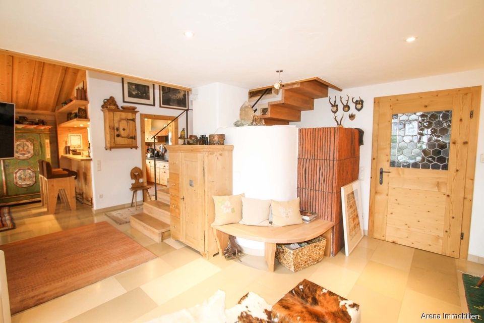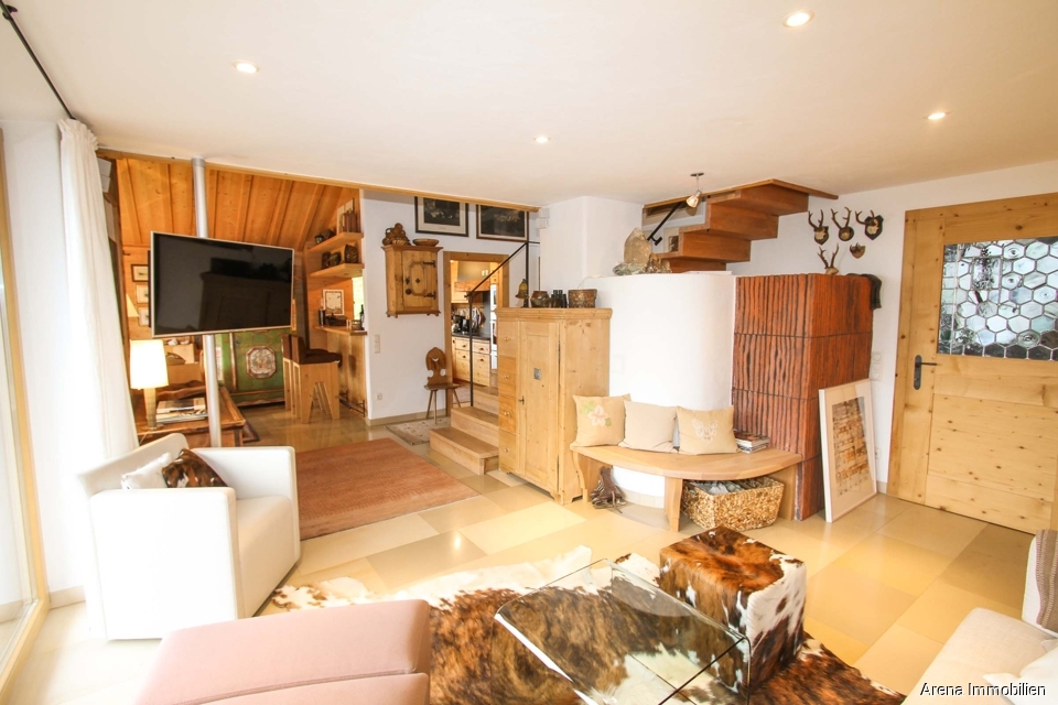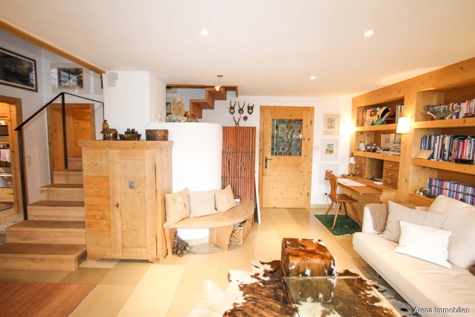 Im unteren Stockwerk erwartet Sie ein einladender Wohnbereich mit stilvollem Kachelofen, der an kalten Winterabenden für wohlige Wärme sorgt. Durch die großen Fenster flutet Licht den Raum und lenkt den Blick auf das atemberaubende Bergpanorama. Von hier gelangen Sie auf die nach Süden ausgerichtete Sonnenterrasse – der perfekte Ort, um die Seele baumeln zu lassen und die frische Bergluft zu genießen.