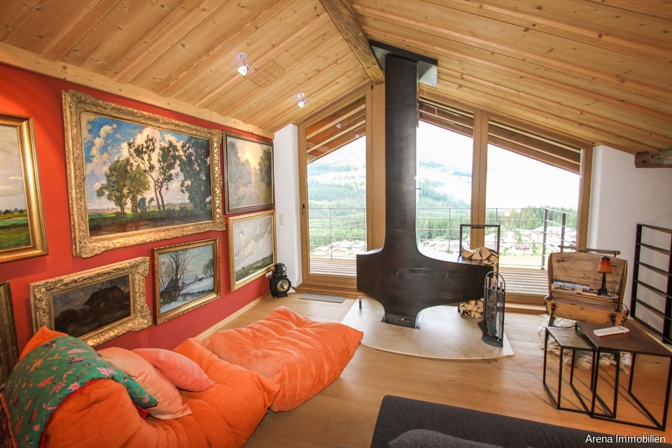 Über eine offene Galerie gelangen Sie in das Obergeschoss, das mit seiner luftigen Architektur und dem modernen Ofen eine besondere Atmosphäre schafft. Eine gemütliche Lounge mit Panoramablick bietet den idealen Platz für entspannte Abende mit einem Glas Wein. Ein weiteres Schlafzimmer mit viel Holz und alpinem Flair sowie ein zusätzliches Badezimmer mit Dusche befinden sich ebenfalls auf dieser Ebene.